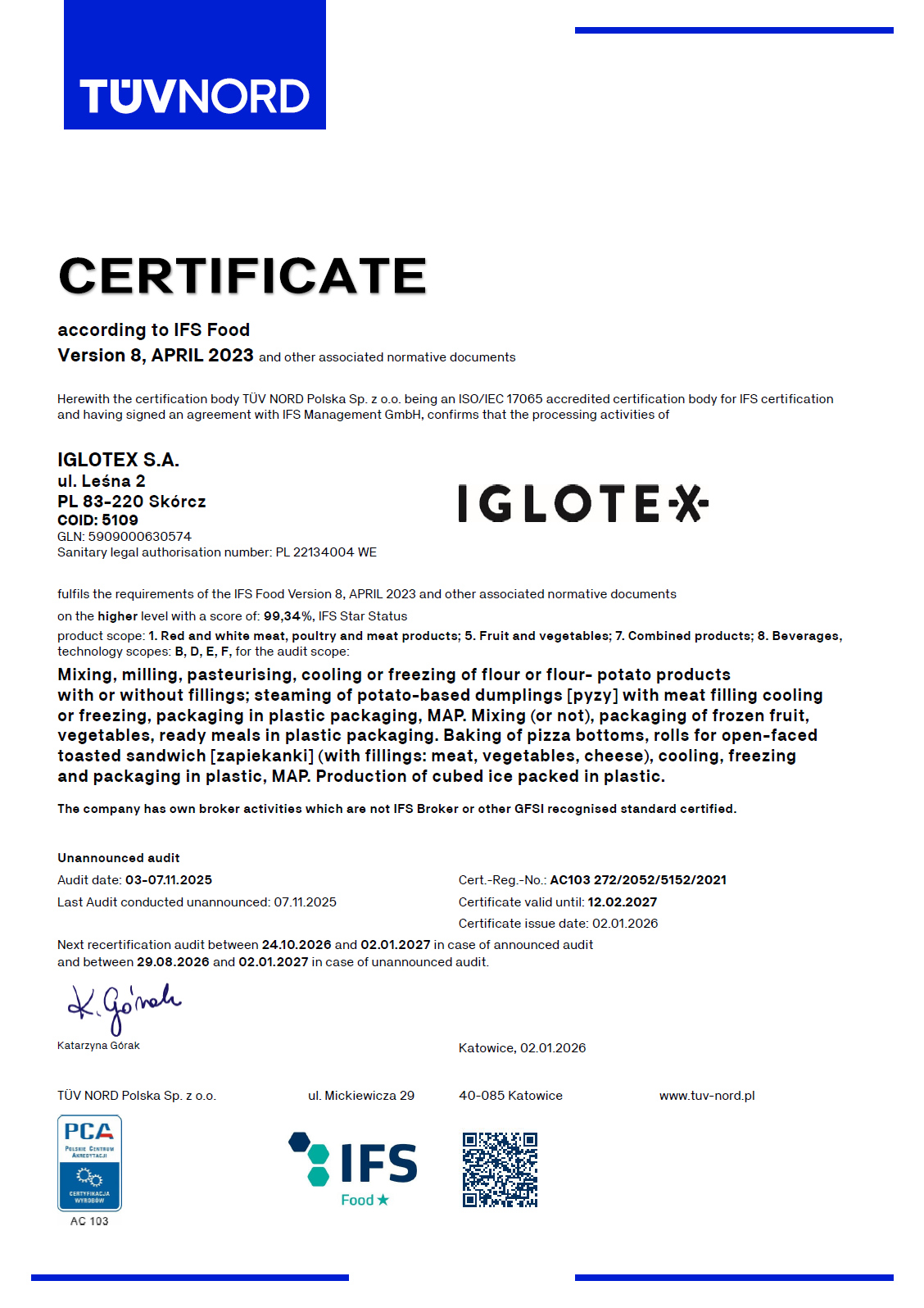 Certyfikat IFS Food IGLOTEX